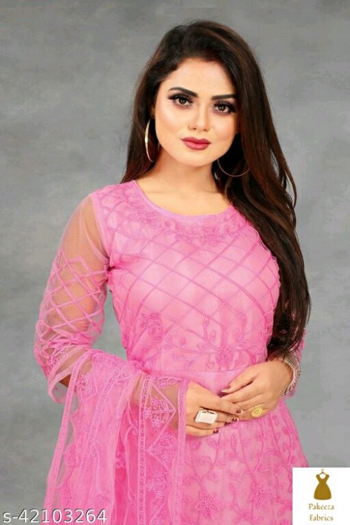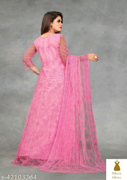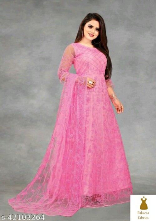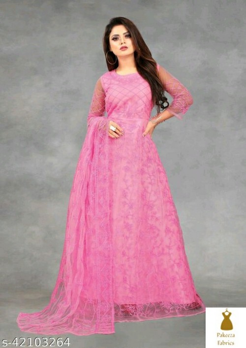Net Embroidered Semi-Stitched Gown (Sky_Free Size) Top Fabric: Net Lining Fabric: No Lining Bottom Fabric: No Bottomwear Dupatta Fabric: Net Pattern: Embroidered Multipack: Single Colour : Sky, Fabric: Net, Work : Chain Stitch Embroidered, Gown is Comes With Inner and Dupatta Available 2.20 Meter.Gown Length is 57 Inch. It has 3/4 Sleeves with Embroidered Work. Gown is Semi-Stitched which can be fitted up to 44 inch Bust Size.Product Color May Slightly Variation Due To Photographic Lighting Or Your Screen Settings And Other Accessories Are Only Modelling Purpose. Sizes: Semi Stitched (Top Bust Size: Up To 44 in, Top Length Size: 57 in, Bottom Length Size: 1.5 m, Dupatta Length Size: 2.15 m)