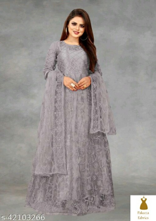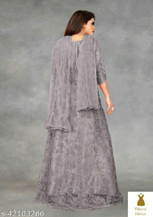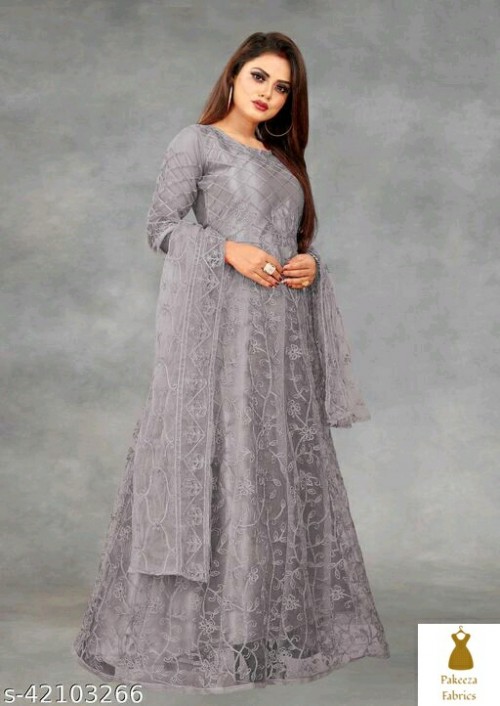 Net Embroidered Semi-Stitched Gown (Sky_Free Size) Top Fabric: Net Lining Fabric: No Lining Bottom Fabric: No Bottomwear Dupatta Fabric: Net Pattern: Embroidered Multipack: Single Colour : Sky, Fabric: Net, Work : Chain Stitch Embroidered, Gown is Comes With Inner and Dupatta Available 2.20 Meter.Gown Length is 57 Inch. It has 3/4 Sleeves with Embroidered Work. Gown is Semi-Stitched which can be fitted up to 44 inch Bust Size. Dry Clean Or Normal Hand Wash. Product Color May Slightly Variation Due To Photographic Lighting Or Your Screen Settings And Other Accessories Are Only Modelling Purpose. Sizes: Semi Stitched (Top Bust Size: Up To 44 in, Top Length Size: 57 in, Bottom Length Size: 1.5 m, Dupatta Length Size: 2.15 m)